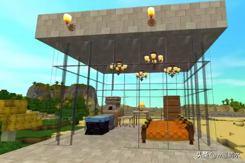 飞行房屋制作需要:标记器(+)、标记器(-)、滑动方块、非自然形成的任意方块、透明玻璃片、床等装饰物。